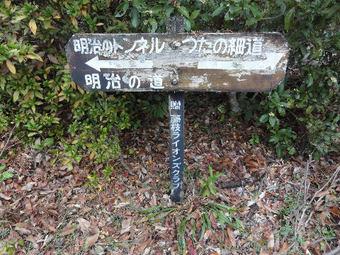 ここで右は旧街道・峠越え、左は明治トンネルへ先に進んでいたグループは左へ行ってしまった、立派な格好だったが峠越えはしないんだ。 |