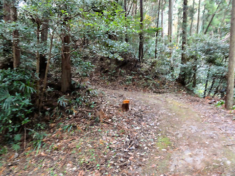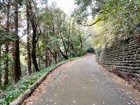 つづら折りの坂道が続くしばらくつづれ織りで登りが続くが道は広く歩きにくくはない、足元は落ち葉だらけ。 |