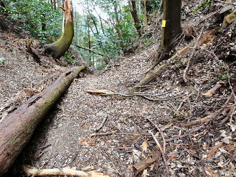 狭い峠は大荒れここが宇津ノ谷峠の最上部だが倒木だらけで大荒れの状態。 |