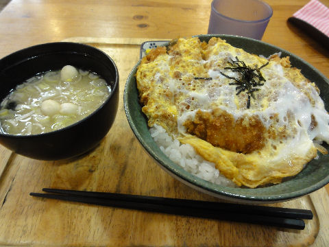 昼食はかつ丼で価格は750円、汁が少なくてご飯が余る。ゆっくり休憩、水分補給。 |