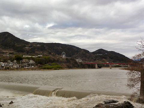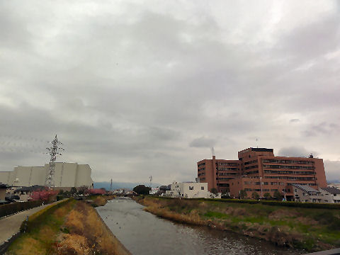 潤井川を越える橋から左手に富士市のロゼシアターと市民病院が見える。 |
