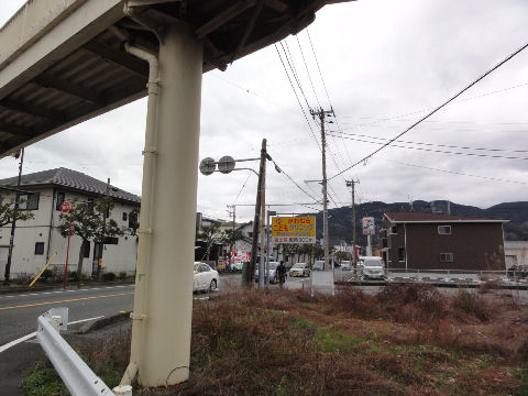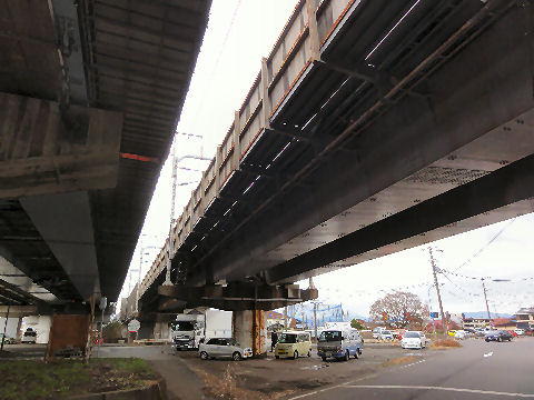 新幹線の高架をくぐるバイパスと新幹線が並んでいる、近くにコンビニの案内があったが閉店していた。 |
