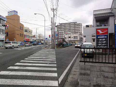 今日はここまで右手が駅となる交差点で来た方向を振り返る。 |