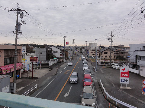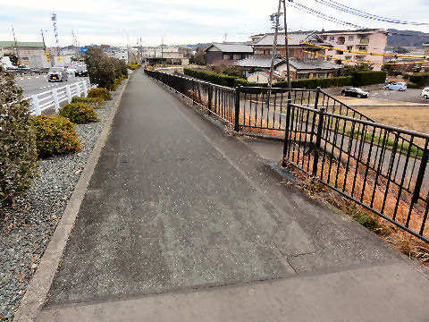 一つ手前の道路ここは加茂川の交差点、横断歩道橋で横断、進んでゆく袋井方向を見る。 |