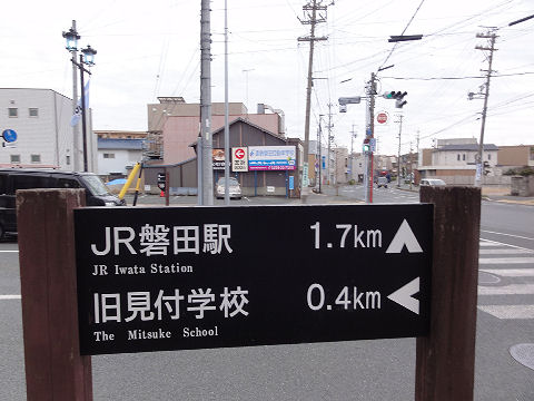 見付宿の案内標識は見付学校前今は磐田だが宿場としての名前は見付。 |