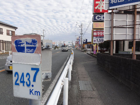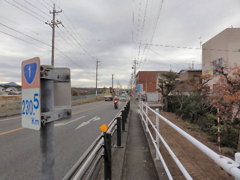 旧1号線、名残りの距離標識現在はバイパスが出来てそちらが1号国道に。 |