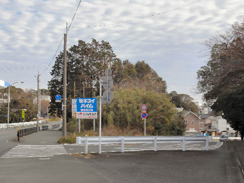 川にぶつかり左手の橋へ橋が無いので旧国道の三ケ野橋を渡る。 |