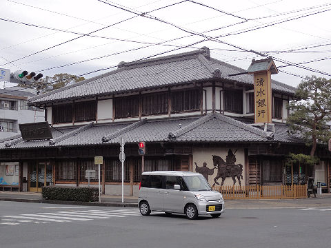 交差点には清水銀行和風の建物が目立つ清水銀行の掛川支店。 |