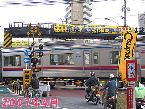 2007年の踏切(高架工事中)前回、京都を目指して歩いた時はまだ高架工事中で平面交差だった。電車が頻繁に通るので踏切は渋滞の原因だった。 |