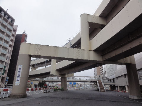 出口の上は羽田線の高架京急羽田線の2階建ての高架が圧倒する。 |