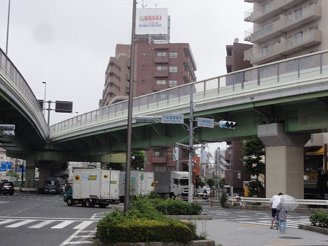 右手の細い道が旧東海道)高架の道路が掛かってうっとうしい空に。 |
