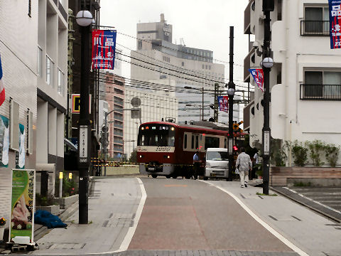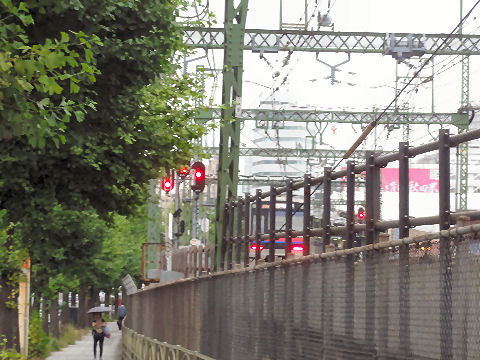 先には京急の踏切、すぐ左は北品川駅電車が上り下りとも続々とくる。 |