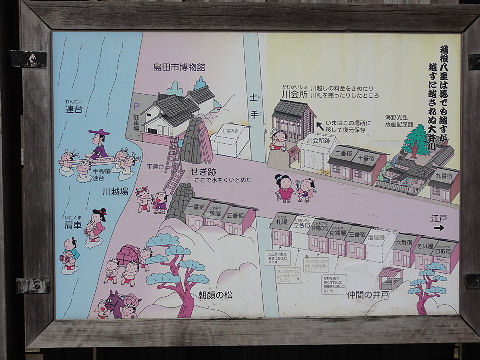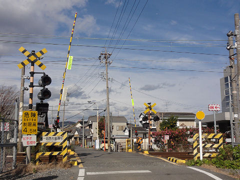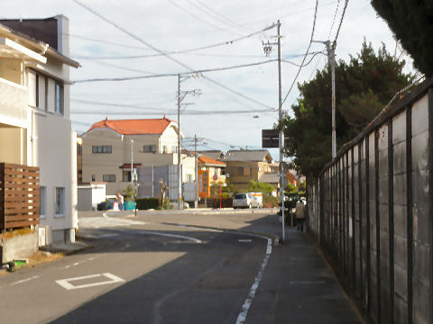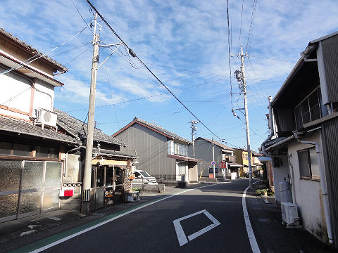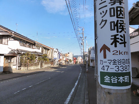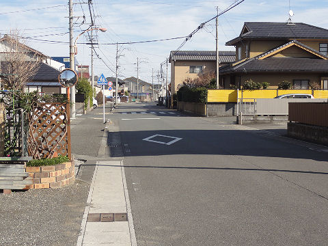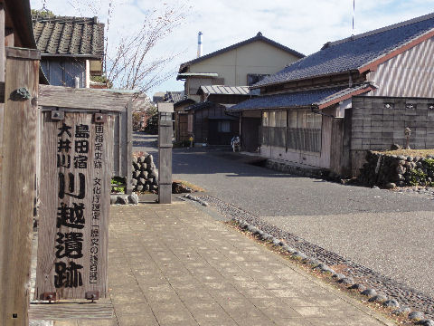 街道は緩やかにカーブし下ってゆく金谷駅は大分高い所にあり川越へ向かい下ってゆく。 |