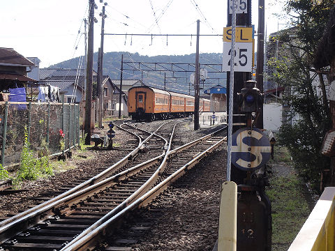 右へ行き大井川鉄道・新金谷駅を見る平日なので列車も少なく観光客もいない |