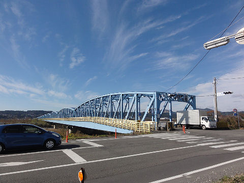 大井川橋東岸へ振り返ってみた大井橋、歩道は下流側のみ、車道は1車線づつ。 |