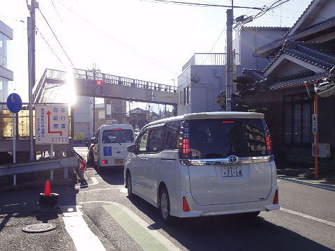 すぐ右手に神社小学生の集団通学が信号を渡って進んでくるが青信号の時間は短いので渋滞気味。 |