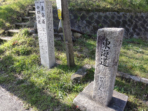 角にある追分の碑みぎ東海道みち、ひだり中山道みち。 |