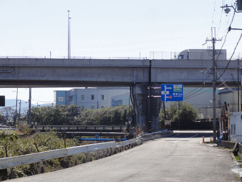 ここはトンネルが撤去され、新しい歩道橋が出来ている堤防上を進めなくなった旧東海道を通すために歩道橋が掛けられている、まだ開通していないので通れない。 |