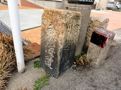 駅前の不思議な石碑真っすぐが東海道、左右が川越、富洲原になっている。 |