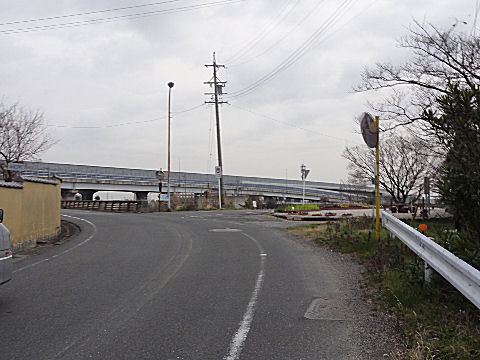 左へ曲がり橋に朝明橋を渡る為に曲がっている。 |