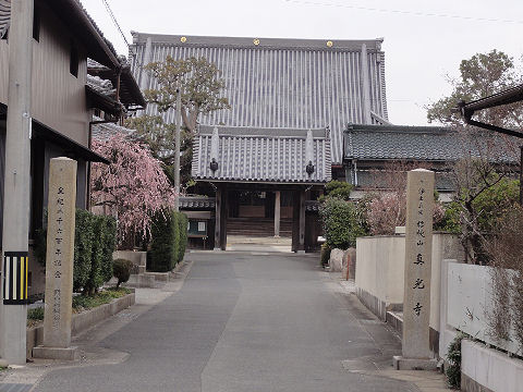 右手へ進む、東海道の標識瓦に葵の紋が入る格式の高いお寺だそう、桑名藩主・松平氏の正室の墓があるとか。 |