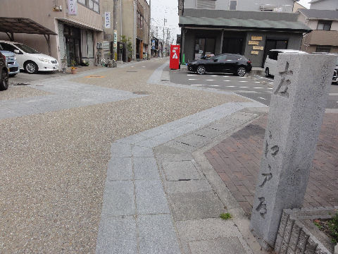 まだまだ東へ歩道部分に緑の舗装が旧街道のガイドらしい。 |