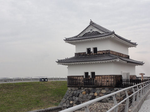 常夜灯からみた櫓このあと堤防上を通り隣にある六華苑を久しぶりに見学して帰った。 |