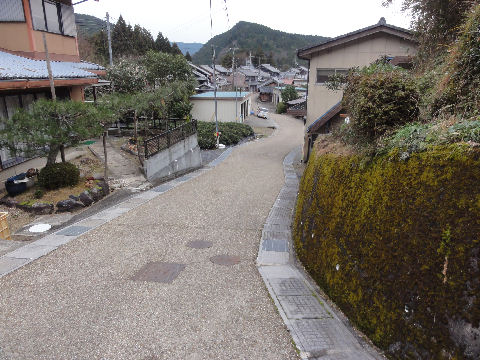 西を望む真っすぐでない街道の町並み。 |