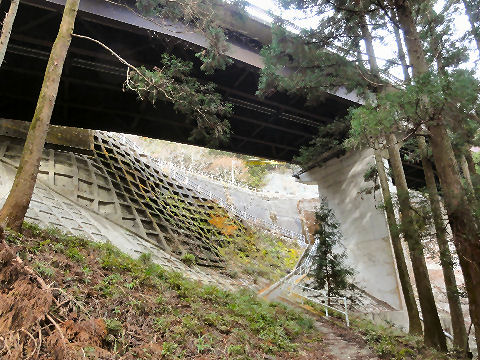 下から見上げた国道以前はここをつづら折りの坂道で下ったのだろうが。 |