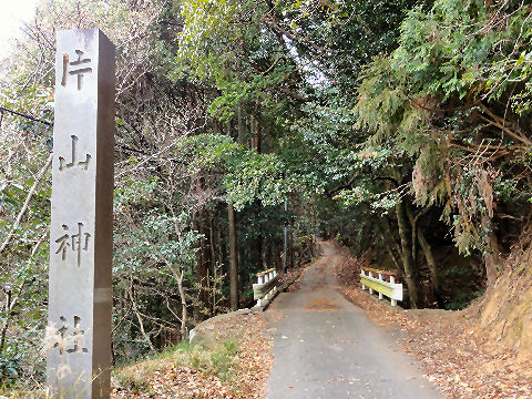 下に片山神社の鳥居やっと片山神社の前まで降りてきた、まだ坂道は続く。 |