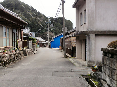 国道の側道を下ってゆく狭い道だが一方通行ではない道。 |