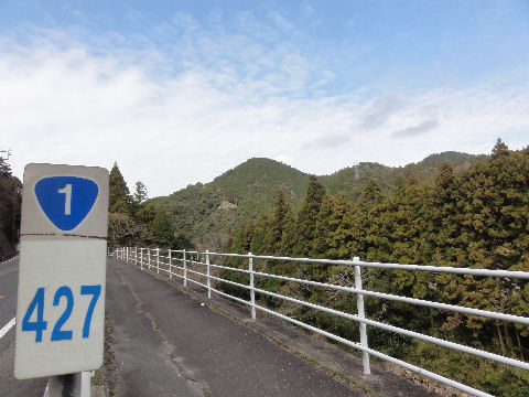 国道は山を削って直進だが左へ下って山を回っていくコースになっている。 |