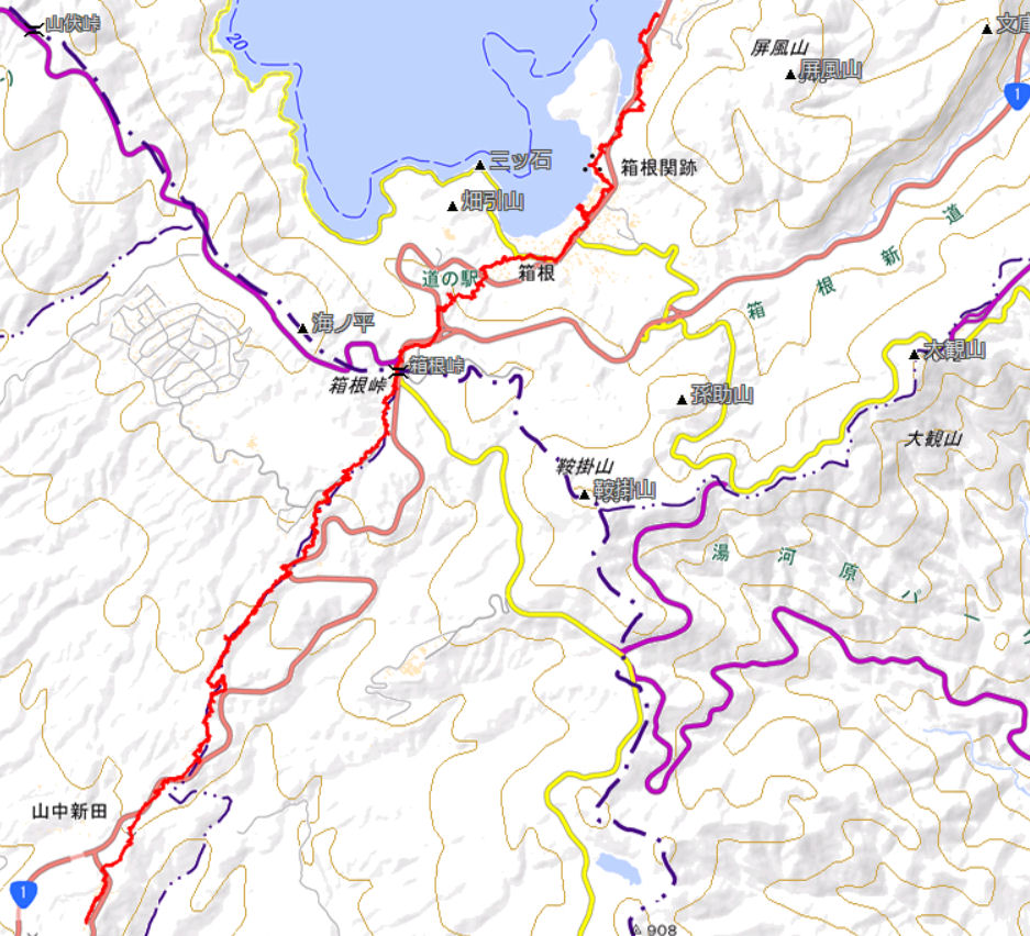 ここから芦ノ湖へ下る箱根新道との交差があり解りにくく歩道がないので歩きにくい。 |