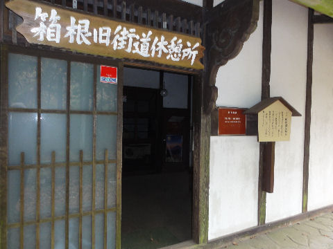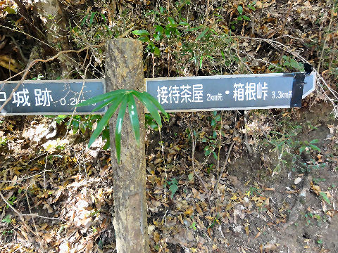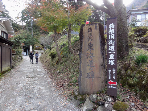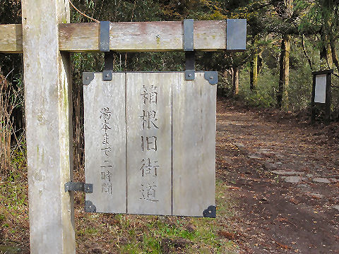ここから関所まで4km西坂(峠から三島宿)の標識。三島宿から15km位で800mの標高差を登ってくる難所だった。 |