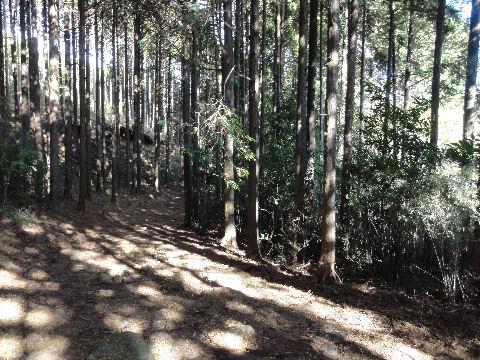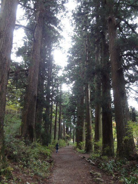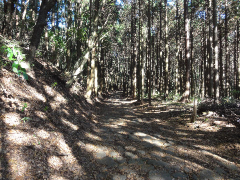 杉の木に囲まれた街道登っても登っても坂が続く、息が切れるので休みながらのぼる。 |