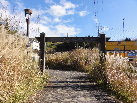 出口にはモニュメントの門駐車場の後ろをぐるっと迂回している。 |