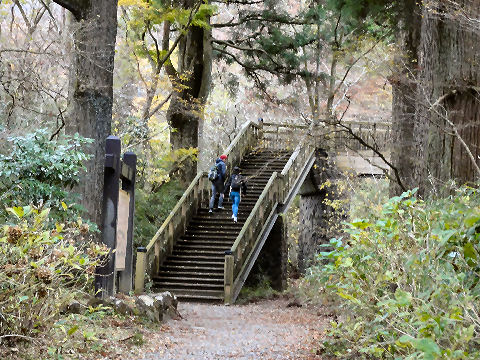 木製の橋で道路を越えて旧道へ目の前を外人さんのカップルが歩いていたが早い、追いつかない。 |