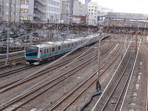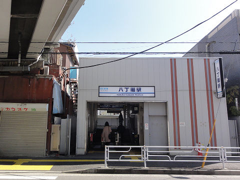 ![]() 京急八丁畷駅京急は地上、上には南部支線と貨物線をつなぐ高架がある。 |