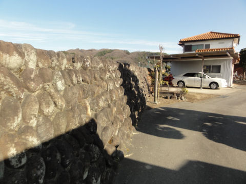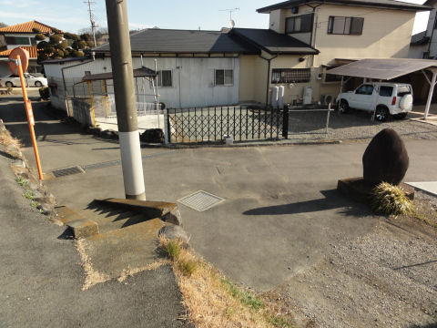 古い石仏の向こうがやってきた方向まっすぐ先には民家が建っていて進めない。 |