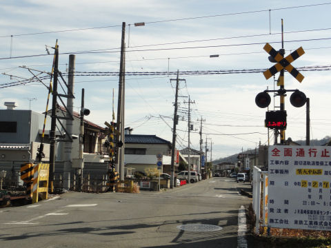 信越線の踏切を越える信越線は右手からきて左手へ進んでゆく、この先でもう交差する場所はない。 |