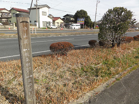 ここから右手の旧道へ左手の奥に一里塚が見えている。 |