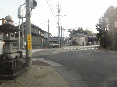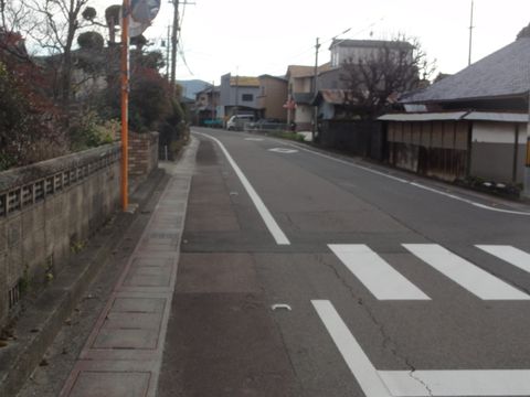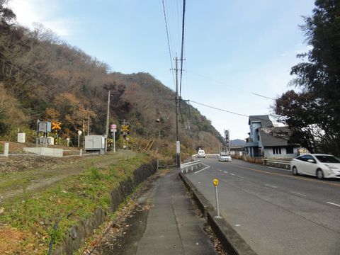 道路を山側へ渡るこの先、線路沿いしか歩道がない。 |