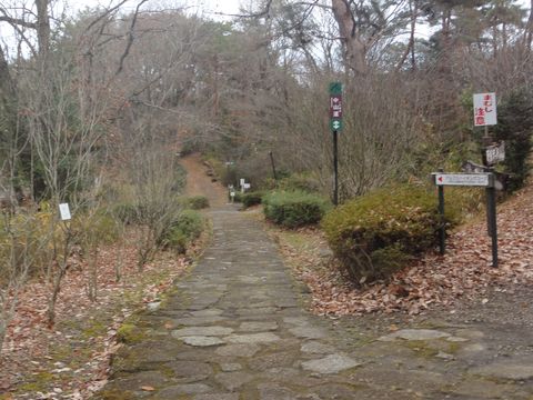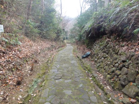 石畳の道を上ってゆく石畳の道も苔があると滑りやすく歩きにくい。 |