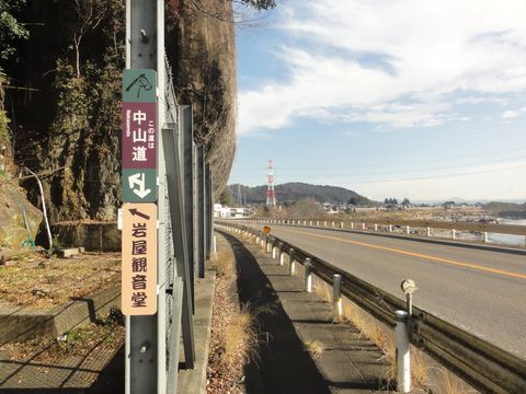 岩屋観音堂へと矢印階段を上って上にある観音堂を指すがここはパスして下の道を行く。 |