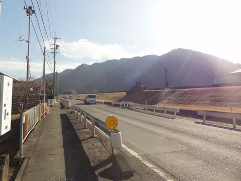 道は左へカーブ橋を越えた道は左へカーブし川の上流側へ進む。 |