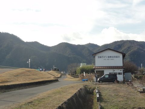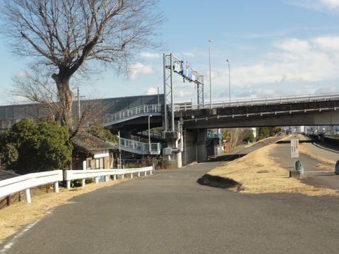 右手は堤防の上に散策路、水位観測所?