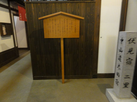 案内標識右は次の伏見宿まで三里とある。。 |