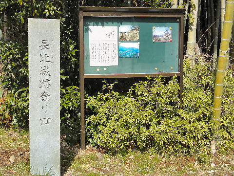 長比城址登り口の石碑東山道(中山道)をおさえるために浅井長政によって築かれた城、織田信長の朝倉氏攻めに際して 離反した長政が、信長の侵攻にそなえて近江と美濃の国境にあるこの地を防衛ラインに設定、いわゆる「境目の城」として築城。 |