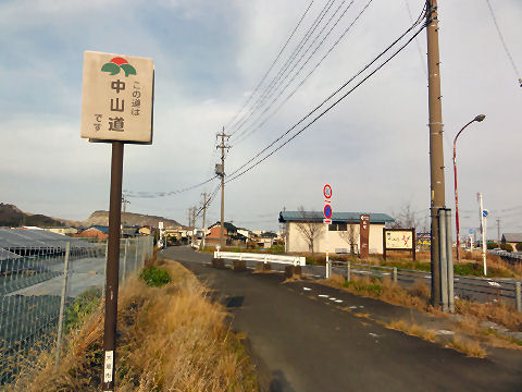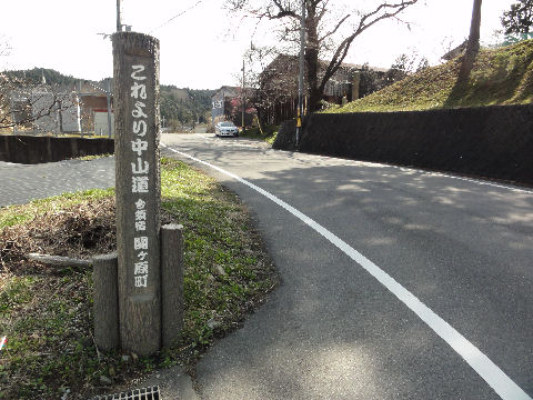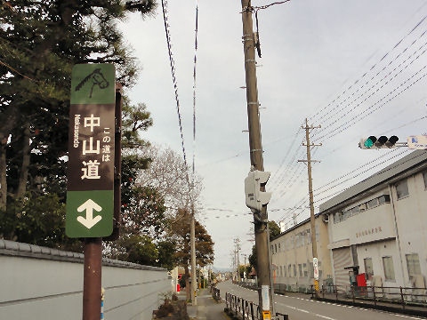 一里塚の先で国道を横断し旧道へ信号もないが車の切れ目をみて反対側へ渡る、休日で交通量が少ない。 |