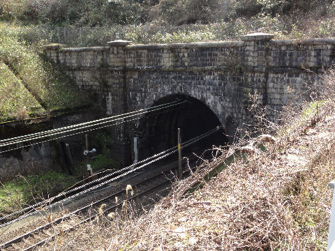 右手に東海道線のトンネル出口先の旧道入口の手前でトンネルに入った線路がここで出てくる。 |